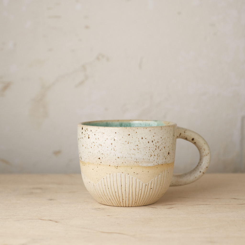 Każdy kubek został wytoczony na kole garncarskim z jasnej gliny oraz ozdobiony ręcznie. Dlatego też mogą występować delikatne różnice między kolorami, kształtami oraz wielkościami naczyń ze zdjęcia. Wszystkie naczynia pokryte są szkliwami, które są przeznaczone do kontaktu z żywnością i świetnie nadają się do codziennego użytku. Wzorki wyżłobione są w glinie i angobie. Można je myć w zmywarce.