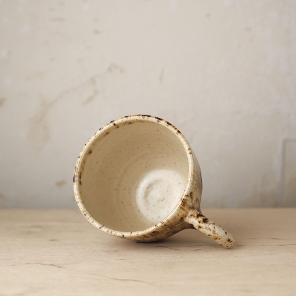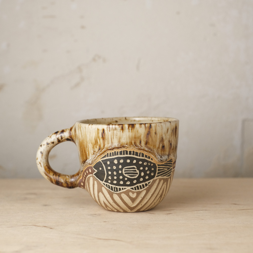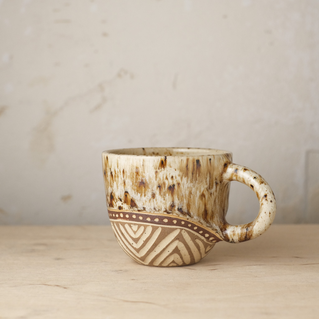 Każdy kubek został wytoczony na kole garncarskim z jasnej gliny oraz ozdobiony ręcznie. Dlatego też mogą występować delikatne różnice między kolorami, kształtami oraz wielkościami naczyń ze zdjęcia. Wszystkie naczynia pokryte są szkliwami, które są przeznaczone do kontaktu z żywnością i świetnie nadają się do codziennego użytku. Wzorki wyżłobione są w glinie i angobie. Można je myć w zmywarce.