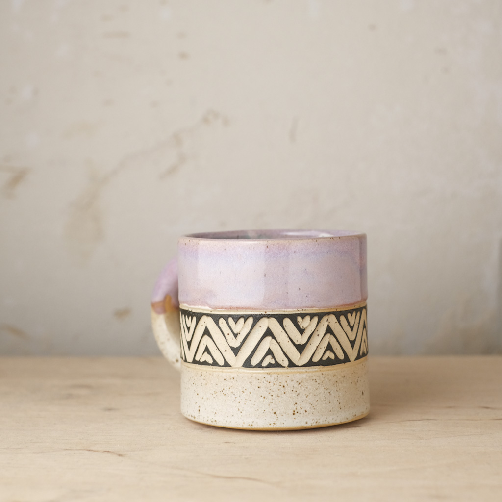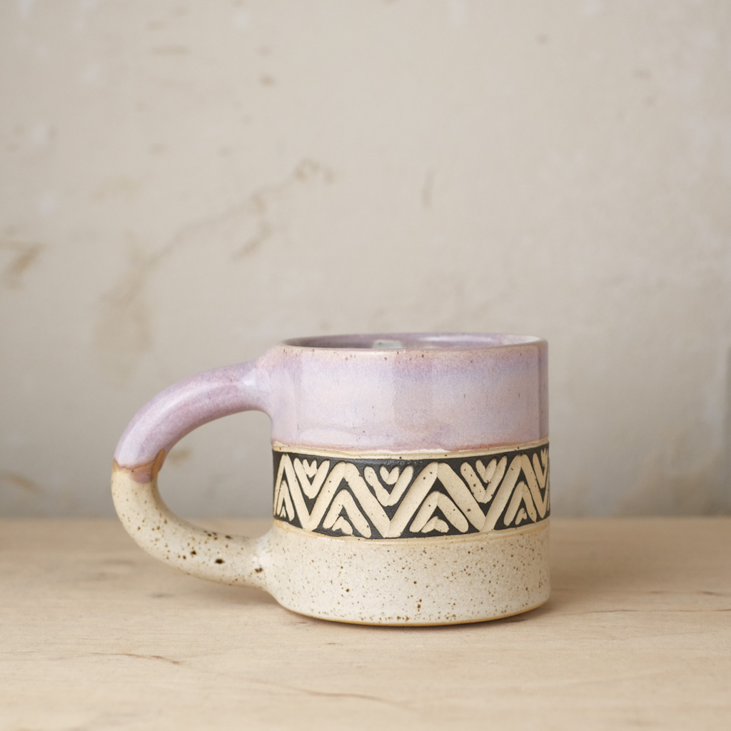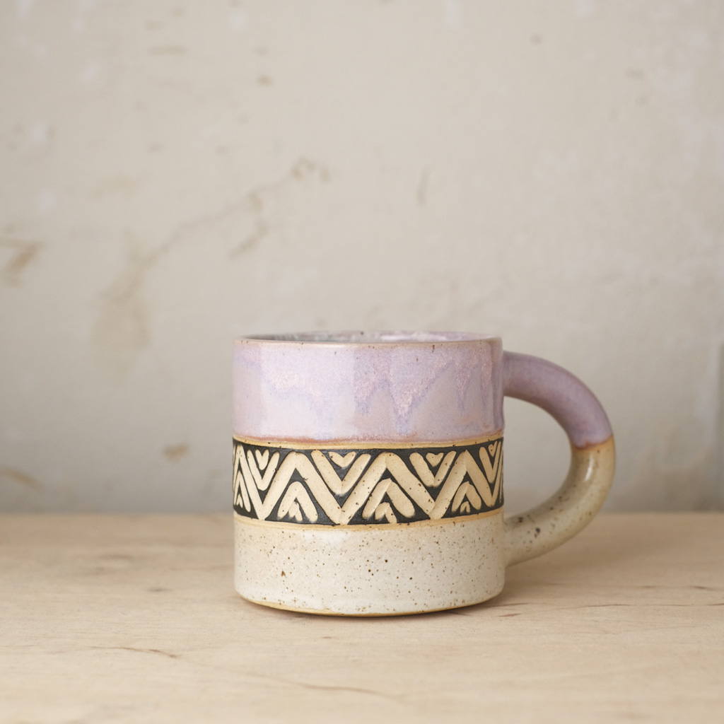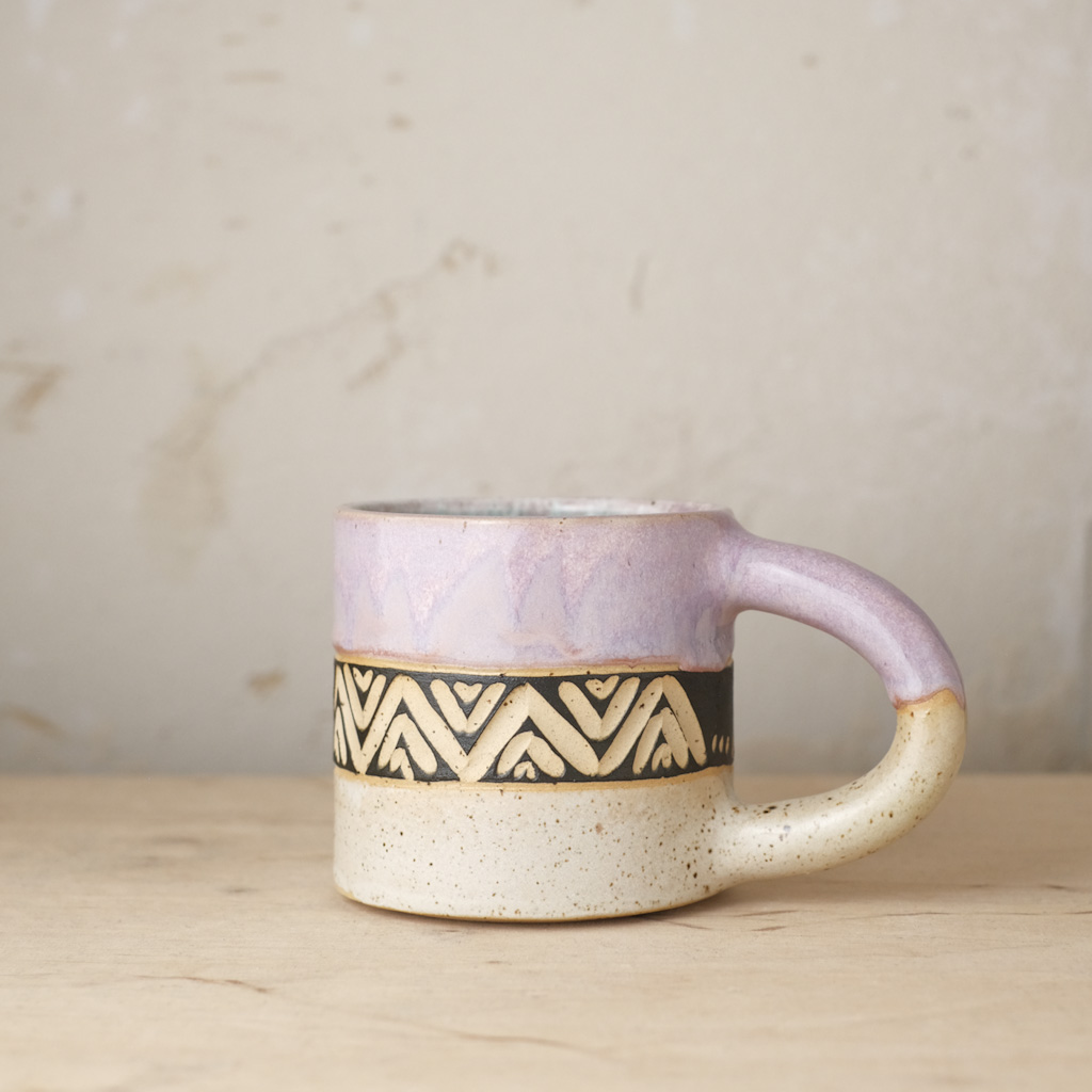 Każdy kubek został wytoczony na kole garncarskim z jasnej gliny oraz ozdobiony ręcznie. Dlatego też mogą występować delikatne różnice między kolorami, kształtami oraz wielkościami naczyń ze zdjęcia. Wszystkie naczynia pokryte są szkliwami, które są przeznaczone do kontaktu z żywnością i świetnie nadają się do codziennego użytku. Wzorki wyżłobione są w glinie i angobie. Można je myć w zmywarce.