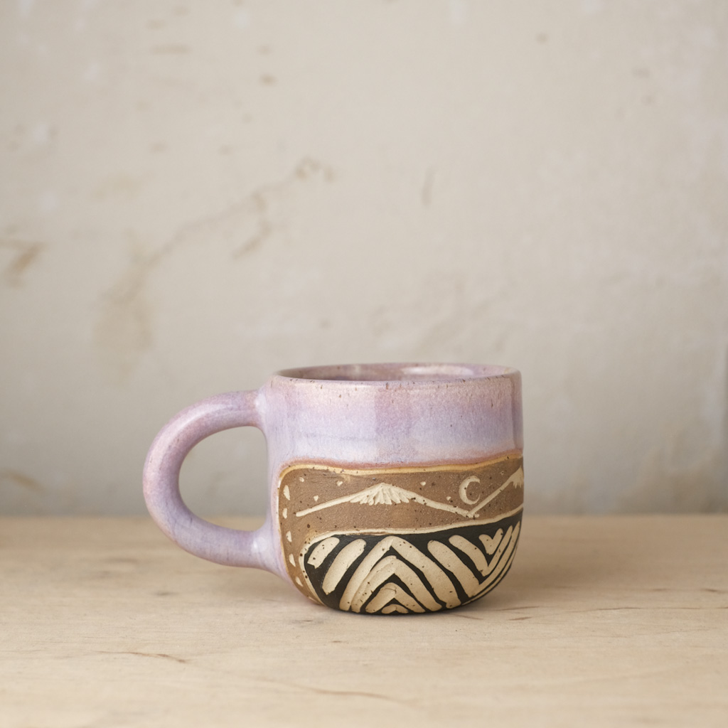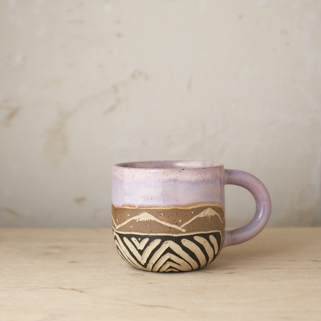 Każdy kubek został wytoczony na kole garncarskim z jasnej gliny oraz ozdobiony ręcznie. Dlatego też mogą występować delikatne różnice między kolorami, kształtami oraz wielkościami naczyń ze zdjęcia. Wszystkie naczynia pokryte są szkliwami, które są przeznaczone do kontaktu z żywnością i świetnie nadają się do codziennego użytku. Wzorki wyżłobione są w glinie i angobie. Można je myć w zmywarce.