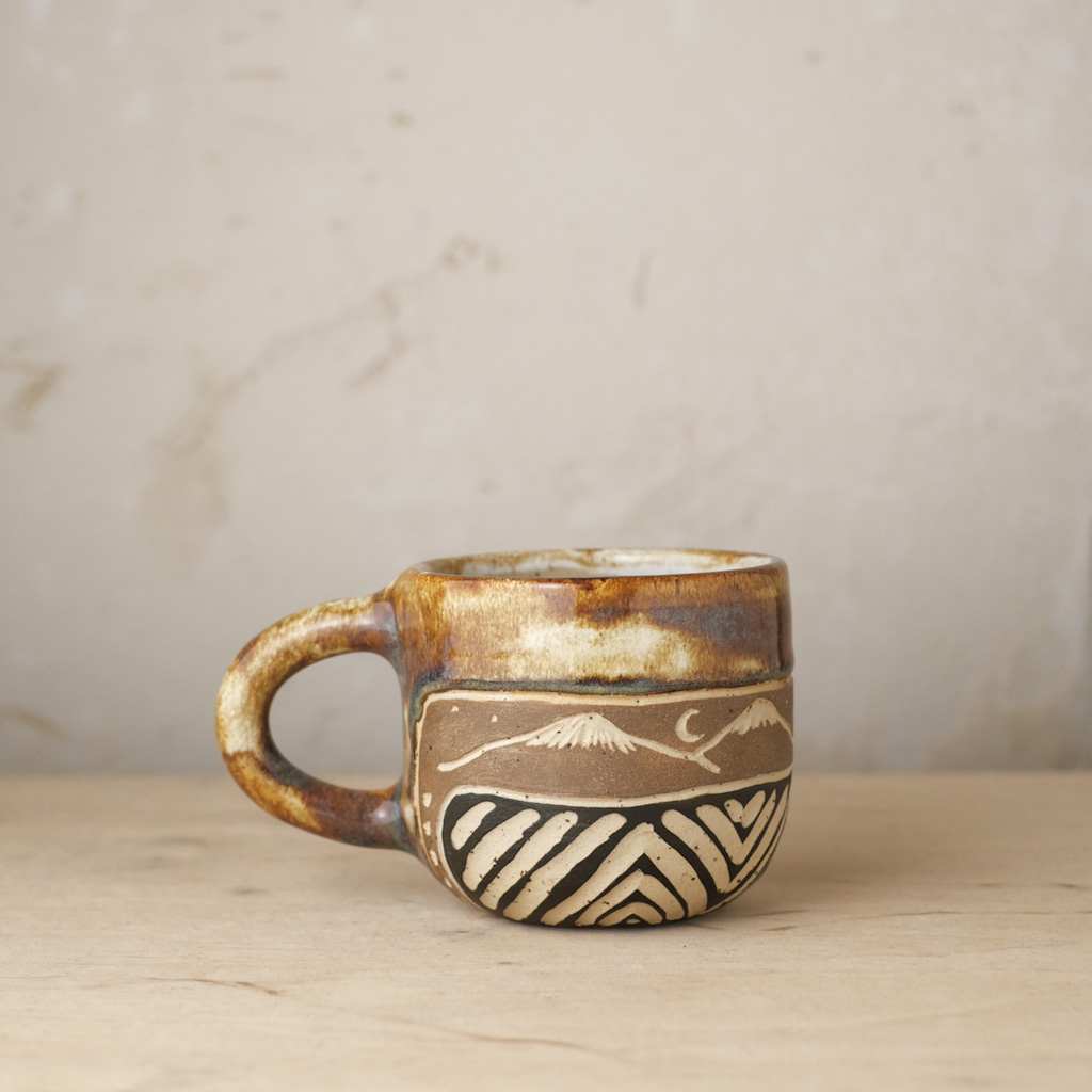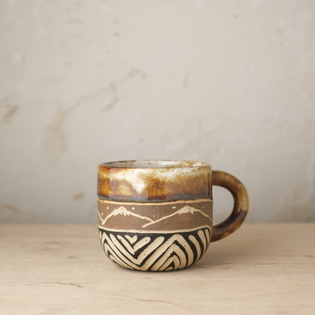 Każdy kubek został wytoczony na kole garncarskim z jasnej gliny oraz ozdobiony ręcznie. Dlatego też mogą występować delikatne różnice między kolorami, kształtami oraz wielkościami naczyń ze zdjęcia. Wszystkie naczynia pokryte są szkliwami, które są przeznaczone do kontaktu z żywnością i świetnie nadają się do codziennego użytku. Wzorki wyżłobione są w glinie i angobie. Można je myć w zmywarce.
