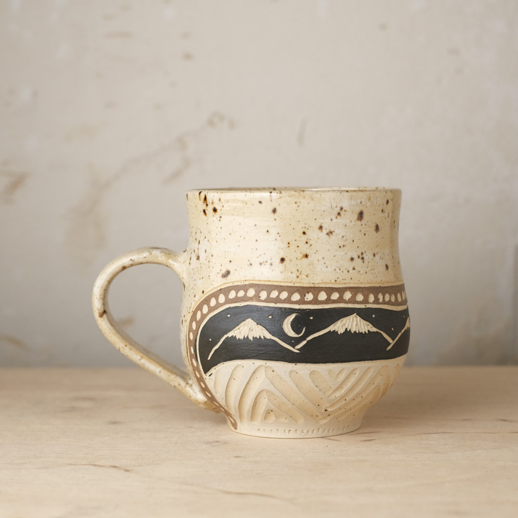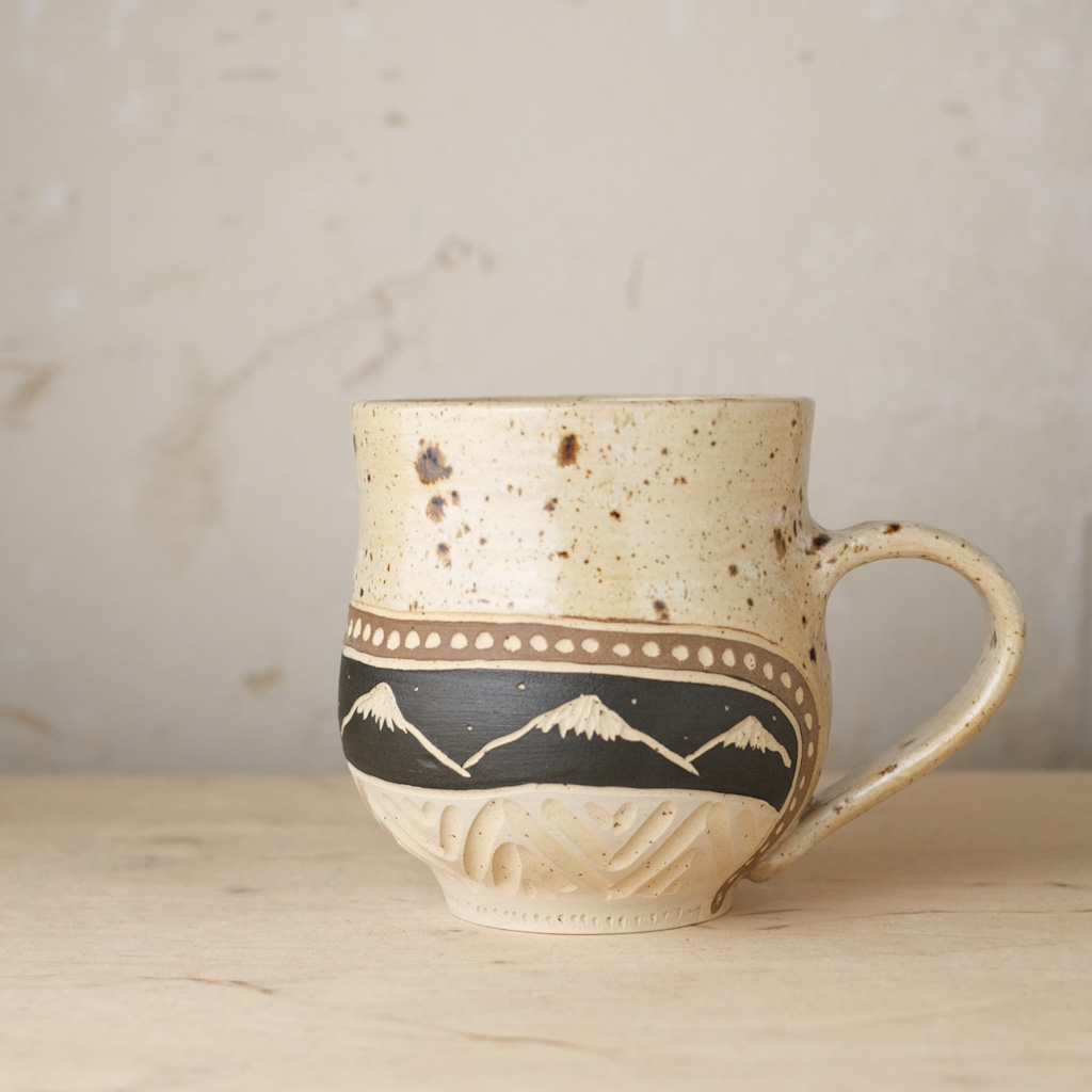 Każdy kubek został wytoczony na kole garncarskim z jasnej gliny oraz ozdobiony ręcznie. Dlatego też mogą występować delikatne różnice między kolorami, kształtami oraz wielkościami naczyń ze zdjęcia. Wszystkie naczynia pokryte są szkliwami, które są przeznaczone do kontaktu z żywnością i świetnie nadają się do codziennego użytku. Wzorki wyżłobione są w glinie i angobie. Można je myć w zmywarce.